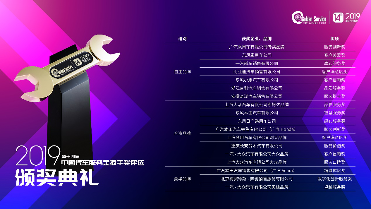 2019中國(guó)汽車服務(wù)金扳手獎(jiǎng)獲獎(jiǎng)榜單(順序不分先后)