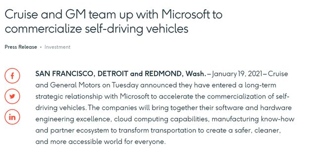 中國汽車新聞1月20日訊 昨日,通用汽車與Cruise聯(lián)合宣布,將與微軟建立長期戰(zhàn)略合作關(guān)系,加速自動駕駛汽車的商業(yè)化部署。此次合作將匯集三方在軟硬件、云計算、生產(chǎn)制造、合作伙伴生態(tài)等領(lǐng)域的強大實力,推動交通轉(zhuǎn)型,為每個人創(chuàng)造更安全、更環(huán)保、更便捷的未來出行。