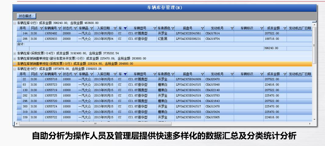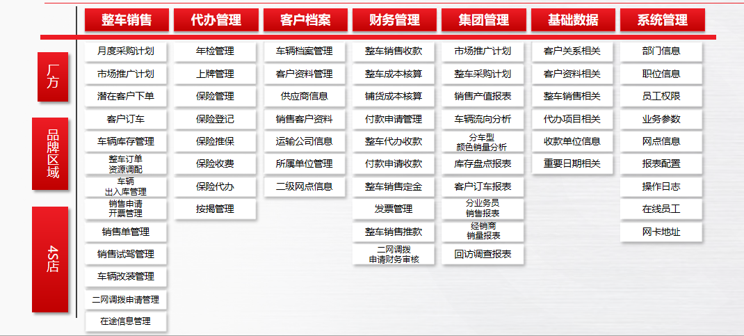 1)銷售管理系統(tǒng):系統(tǒng)涵蓋潛客、售中、車輛前裝、二級網(wǎng)點等功能,融入整車價格政策、潛客戰(zhàn)敗審核等管理思想,有效管理銷售所有業(yè)務(wù)。