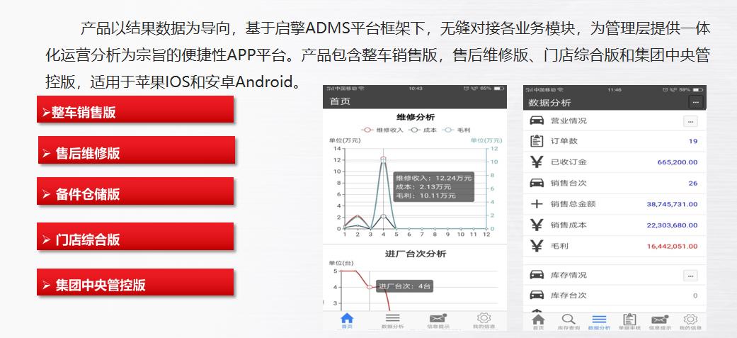 產(chǎn)品以結(jié)果數(shù)據(jù)為導(dǎo)向,基于啟擎ADMS平臺框架下,無縫對接各業(yè)務(wù)模塊,為管理層提供一體化運(yùn)營分析為宗旨的便捷性APP平臺。產(chǎn)品包含整車銷售版,售后維修版、門店綜合版和集團(tuán)中央管控版,適用于蘋果IOS和安卓Android。